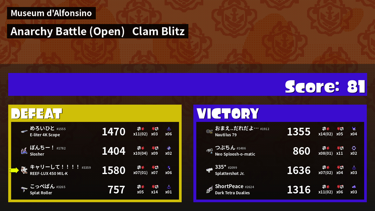 | Mode | Clam Blitz - Anarchy Battle (Open) | ||