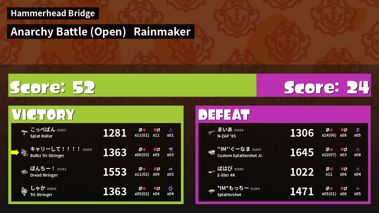 | 魔法の盾  *IM*もっちー #1389 |  Splattershot                    | 1,471 | 4 + 1 | 6 | 0.67 |  5 | |
