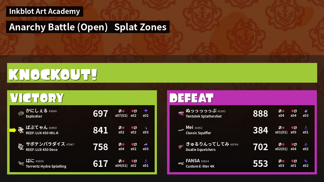 | Mode | Splat Zones - Anarchy Battle (Open) | ||