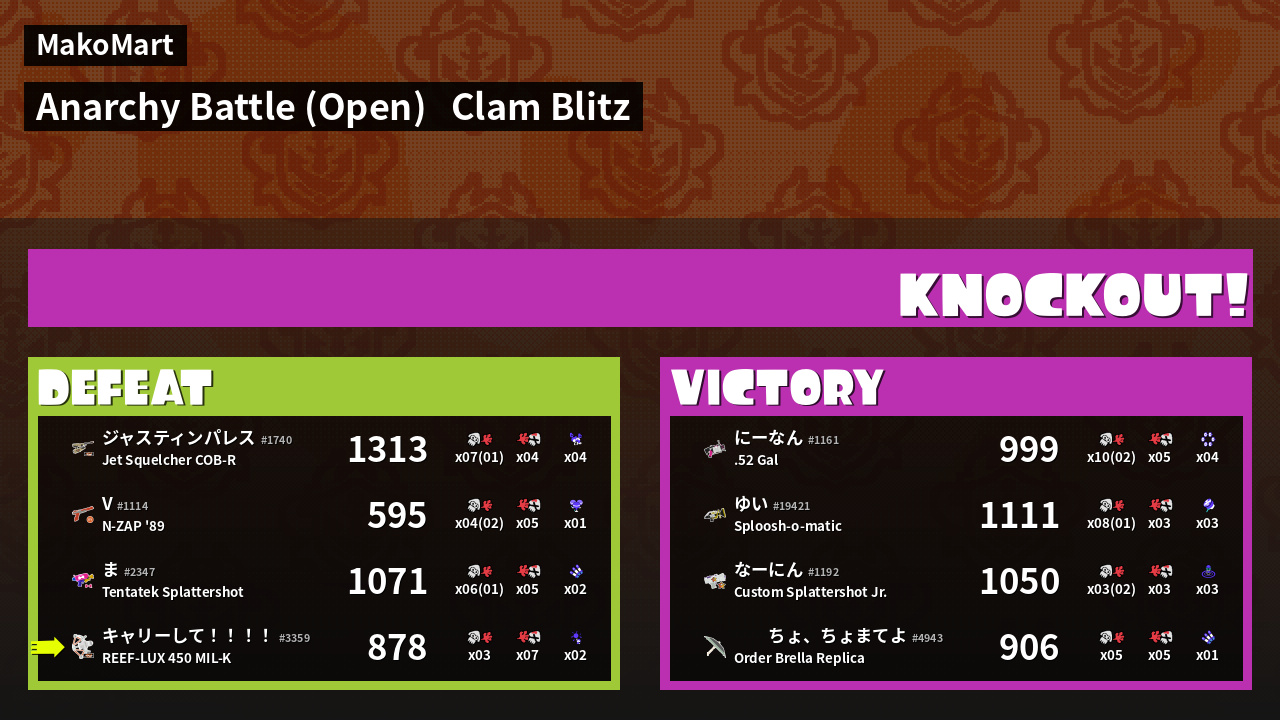 | Mode | Clam Blitz - Anarchy Battle (Open) | ||