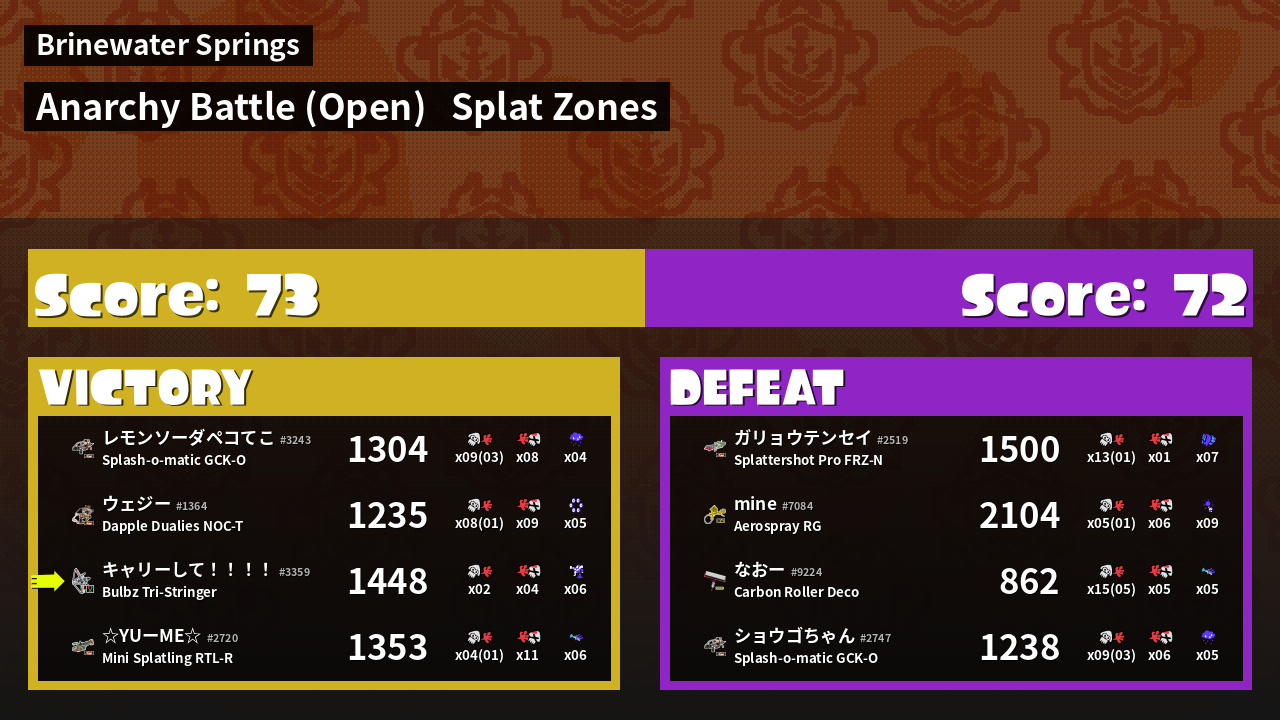 | Mode | Splat Zones - Anarchy Battle (Open) |