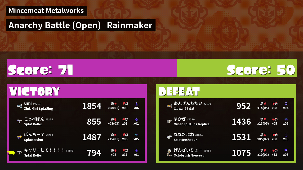 | Mode | Rainmaker - Anarchy Battle (Open) | ||