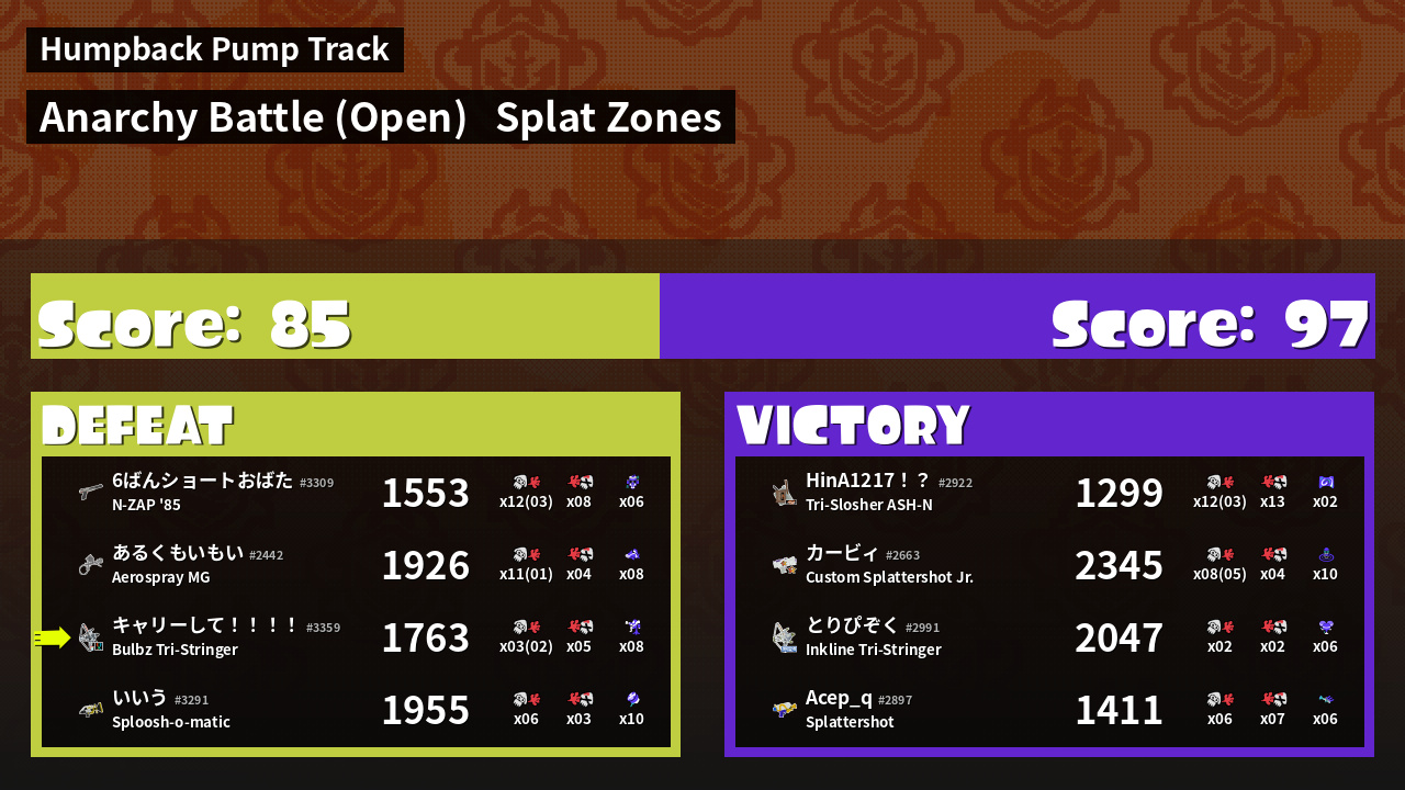 | Mode | Splat Zones - Anarchy Battle (Open) | ||