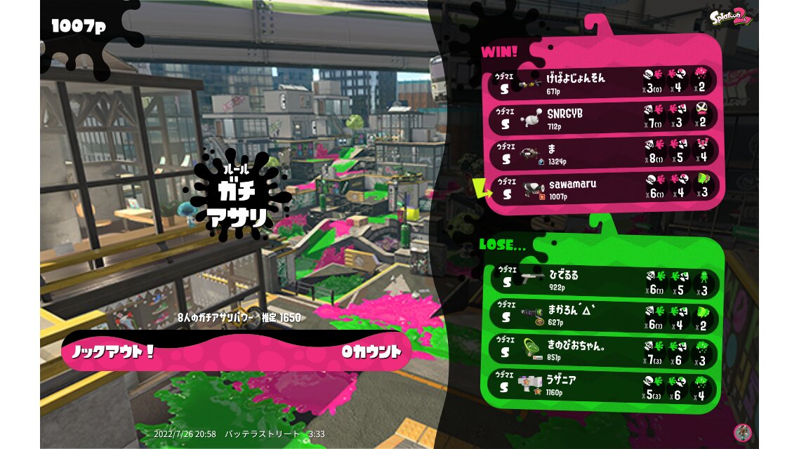 | Name | Weapon | Level | Rank | Inked | k+a/sp | k/d |