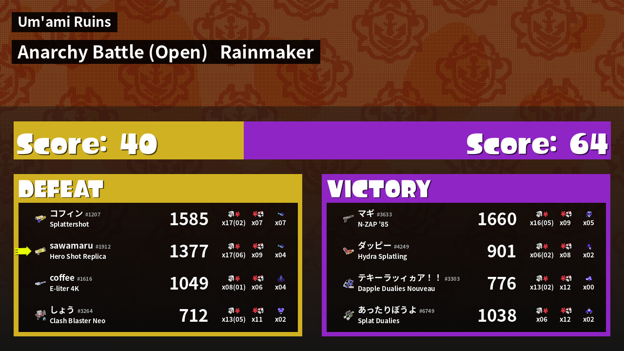 Kills / Deaths | 11 + 6 / 9 > Kill Ratio: 1.22 | ||