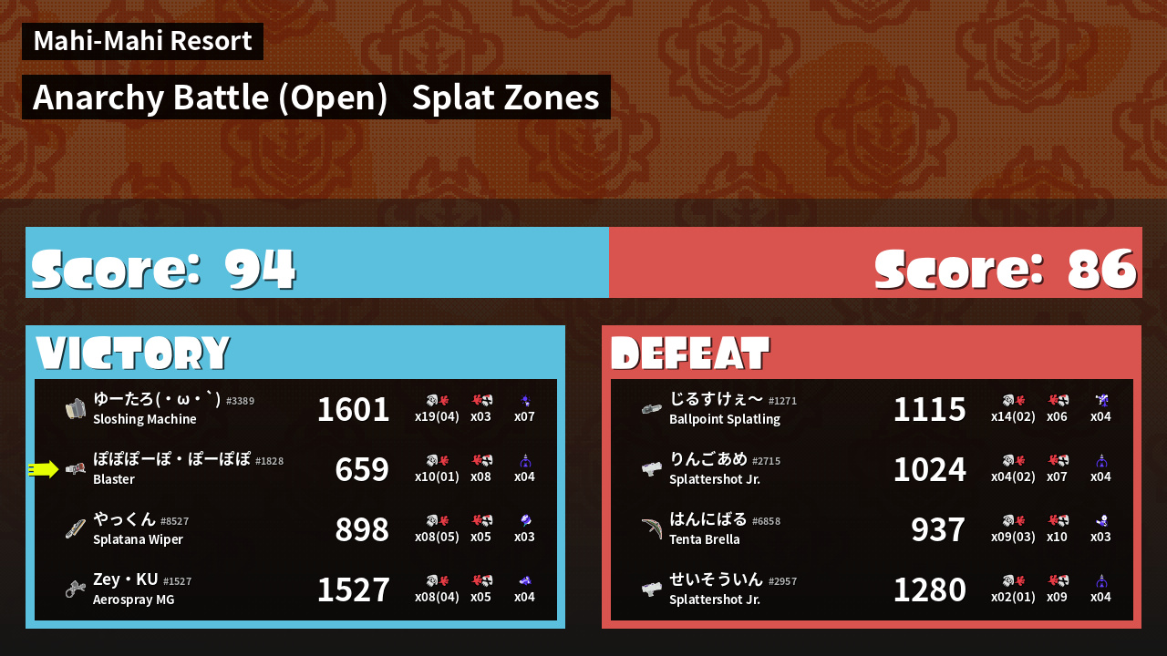 | Mode | Splat Zones - Anarchy Battle (Open) | ||