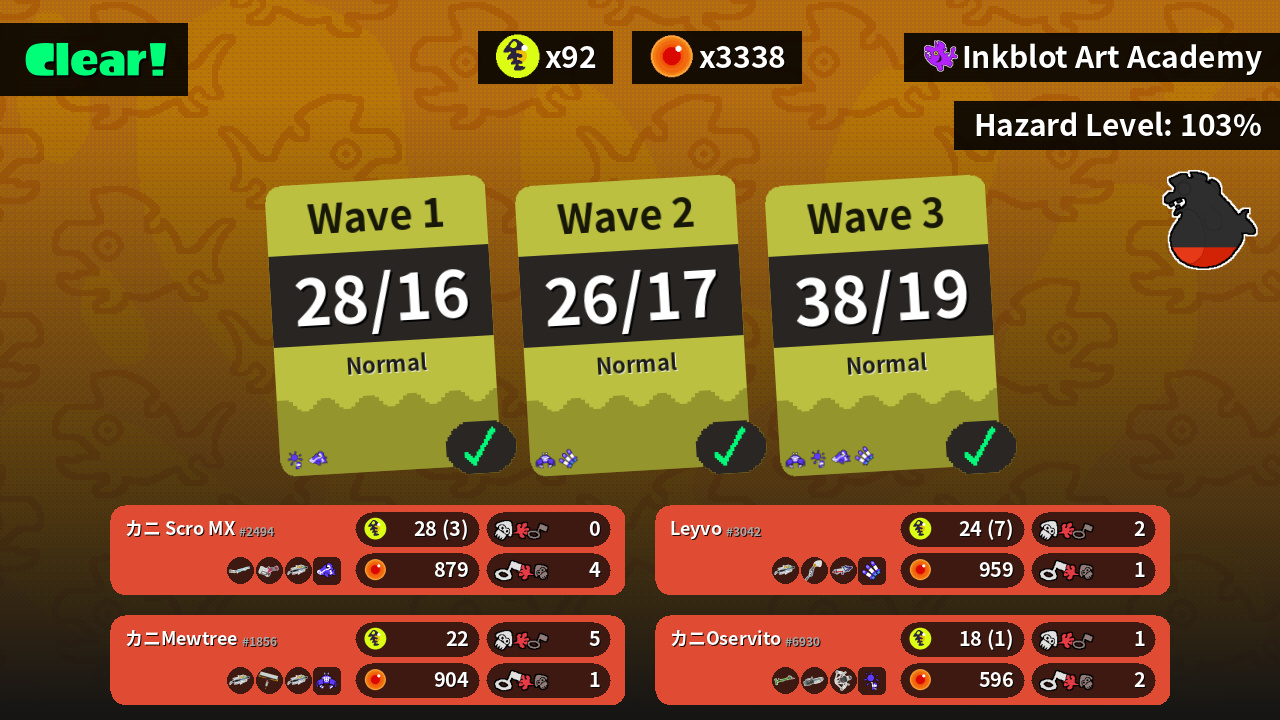 | Weapons | Classic Squiffer Heavy Splatling Grizzco Brella | Grizzco Brella Inkbrush Splattershot Pro | Grizzco Brella Carbon Roller Grizzco Brella | Bamboozler 14 Mk I Ballpoint Splatling REEF-LUX 450 |