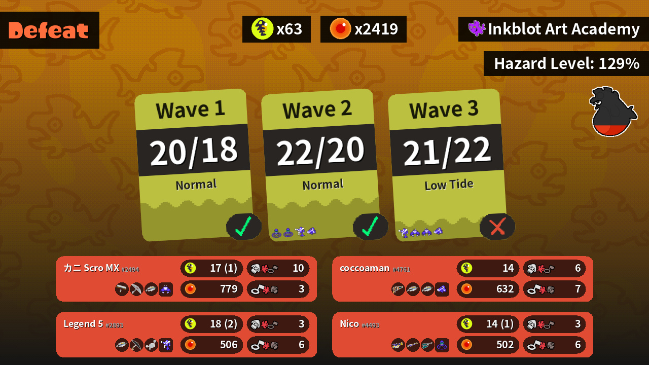 | Weapons | Carbon Roller Splat Brella Grizzco Brella | Grizzco Brella Undercover Brella Luna Blaster | Squeezer Grizzco Brella Grizzco Brella | Mini Splatling Splat Charger Jet Squelcher |
