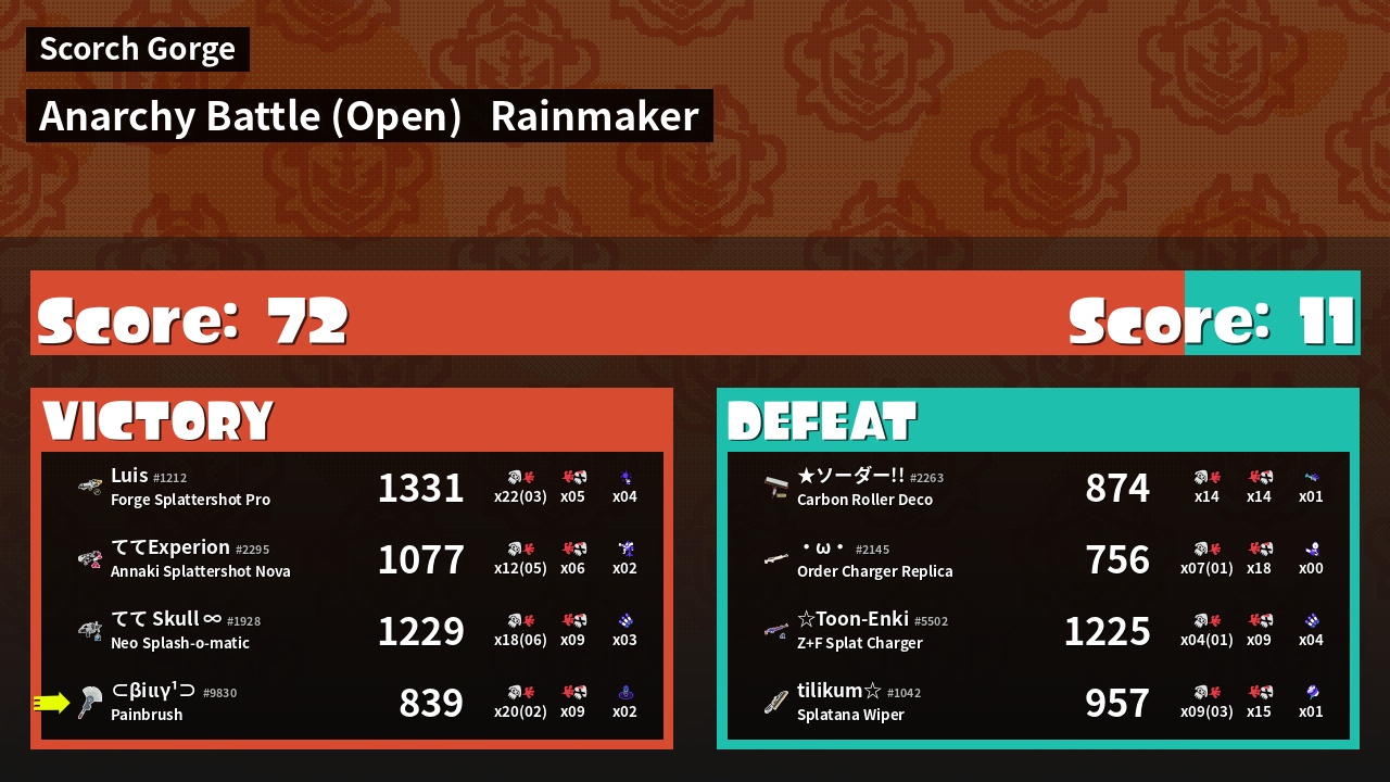 | Medals | #1 Damage Taker #1 Wave Breaker User #2 Overall Splatter | ||