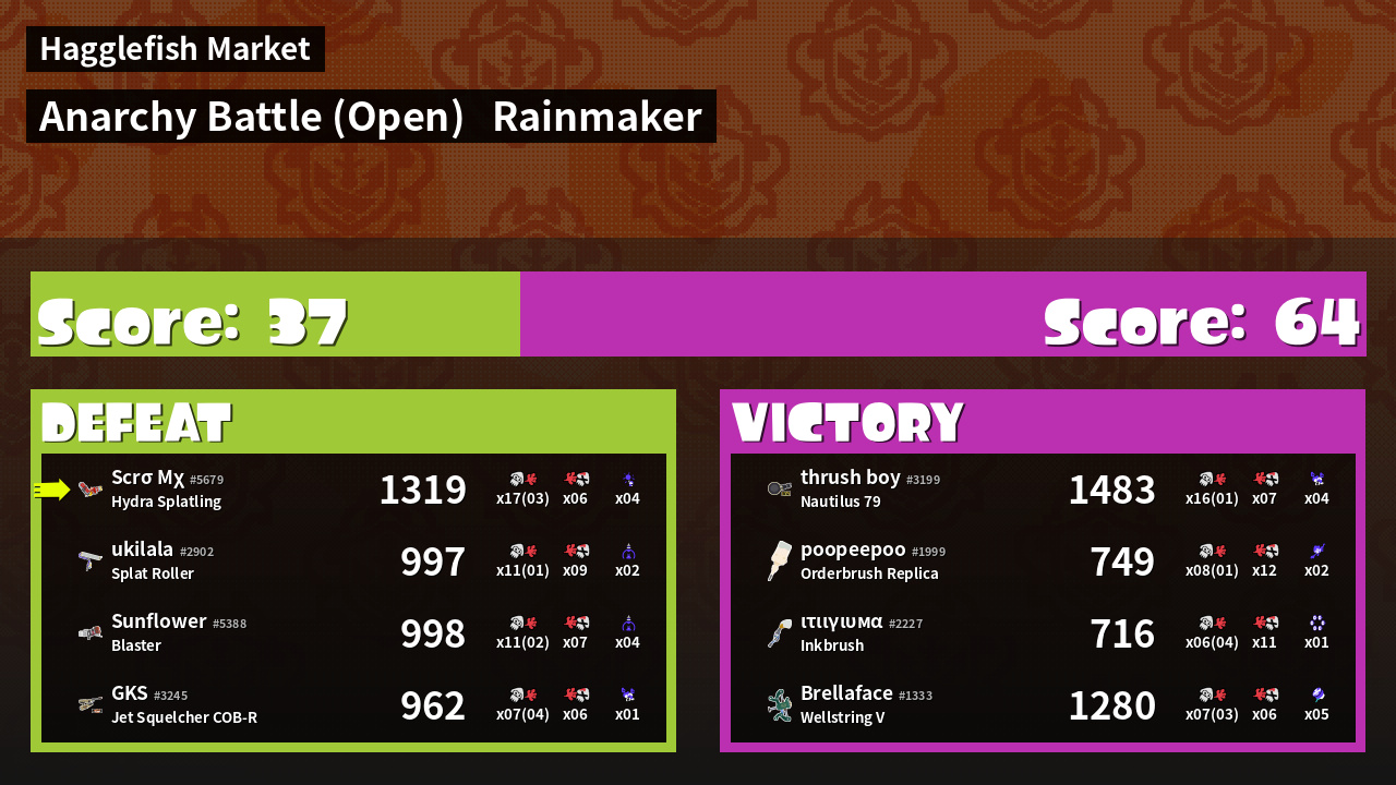 | Medals | #1 Overall Splatter #1 Turf Inker #1 Enemy Splatter |