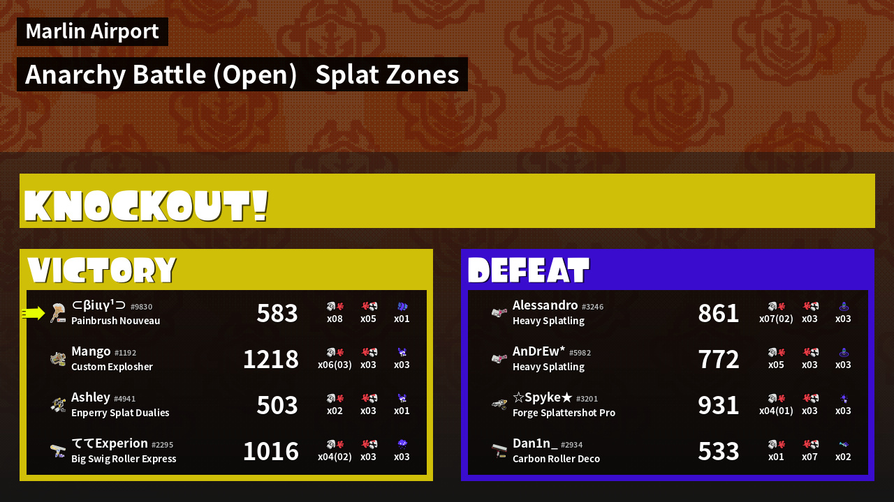 | Medals | #1 Overall Splatter #1 Splat Zone Guard #1 Enemy Splatter | ||