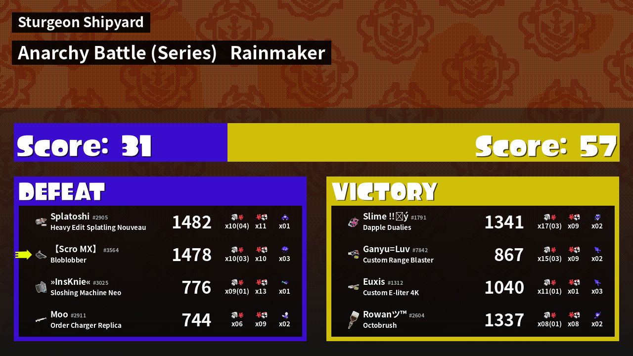 | Medals | #1 Overall Splatter #1 Popular Target #2 Score Booster | ||