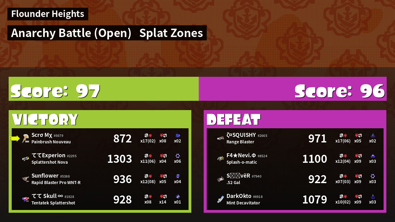| Mode | Splat Zones - Anarchy Battle (Open) |
