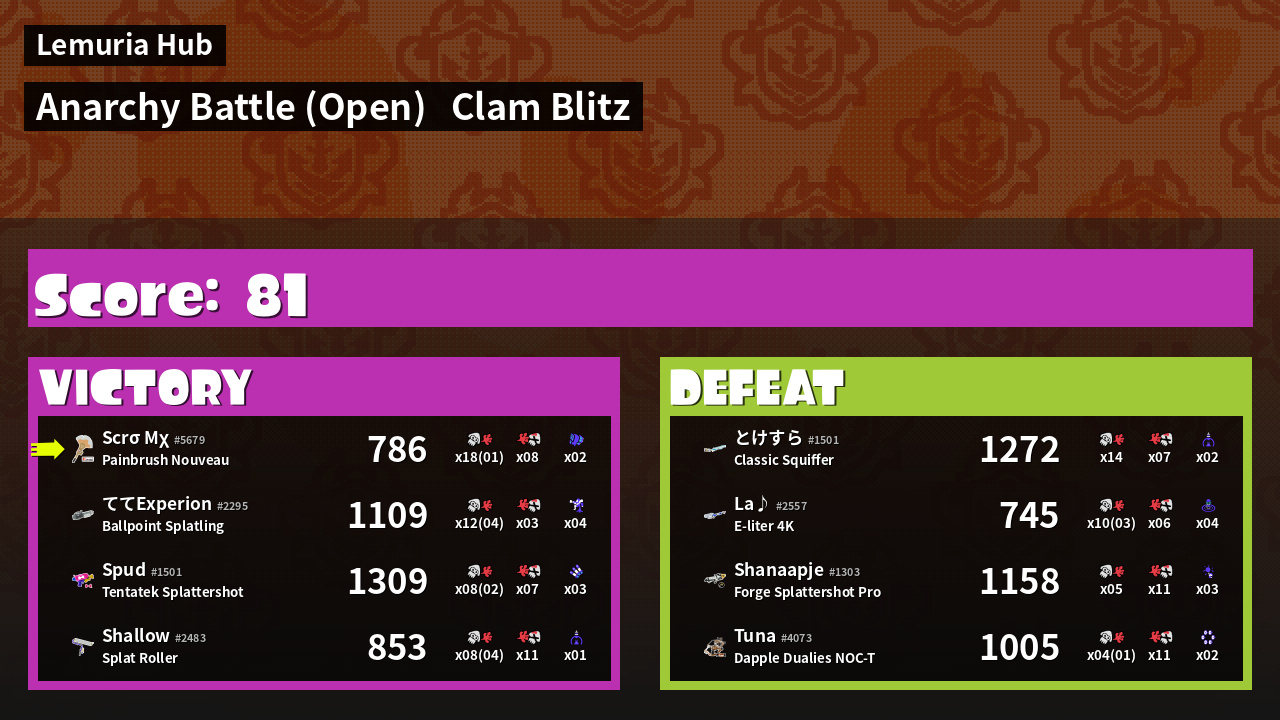 | Mode | Clam Blitz - Anarchy Battle (Open) | ||