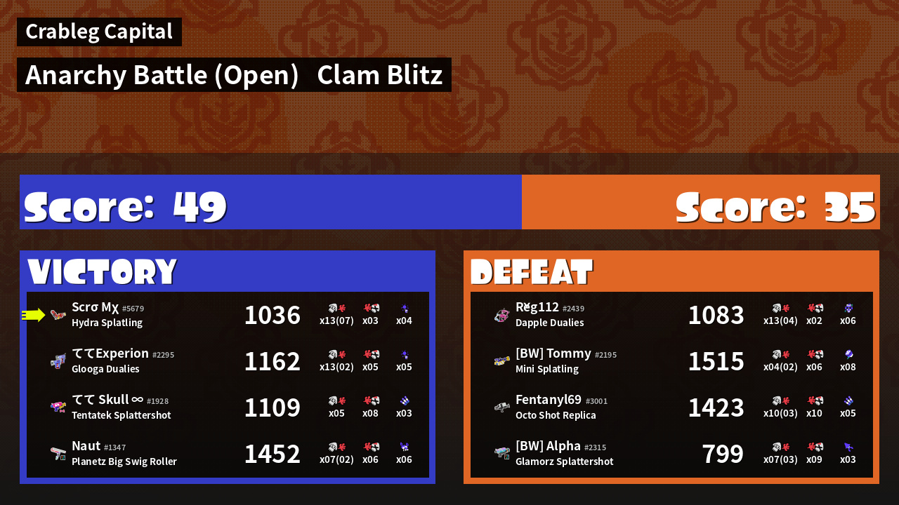 | Mode | Clam Blitz - Anarchy Battle (Open) |