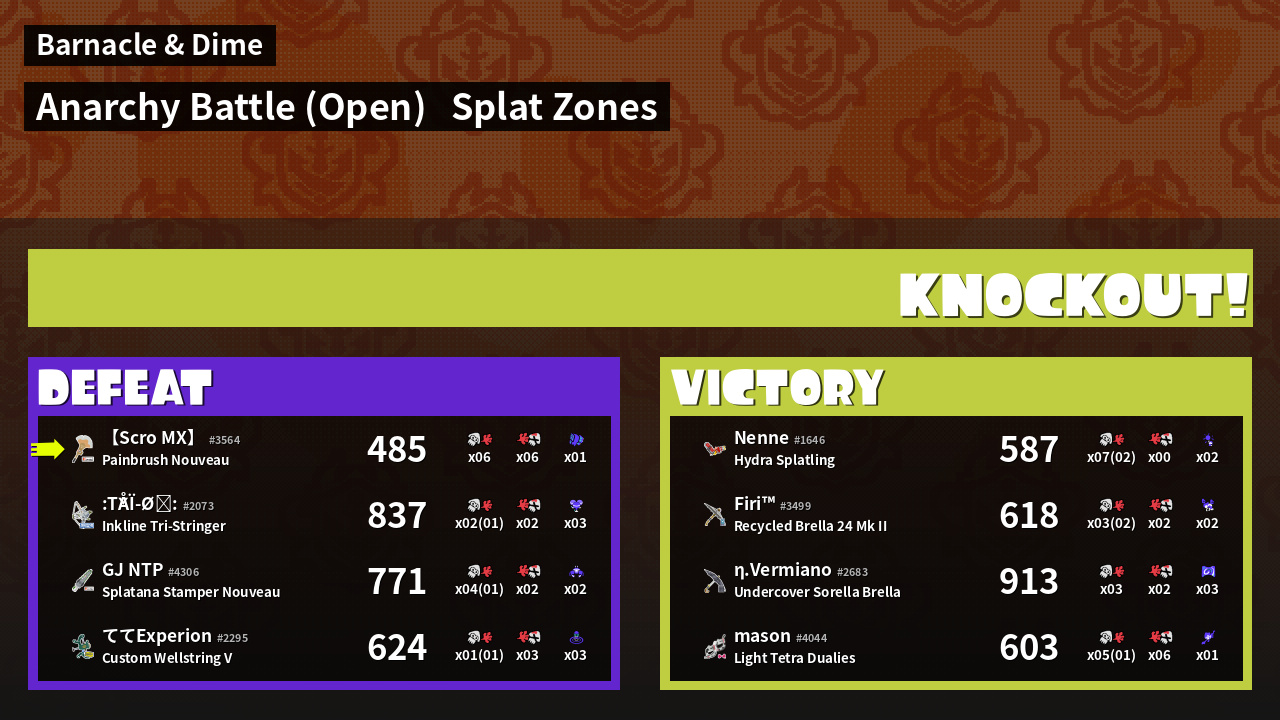 | Mode | Splat Zones - Anarchy Battle (Open) | ||