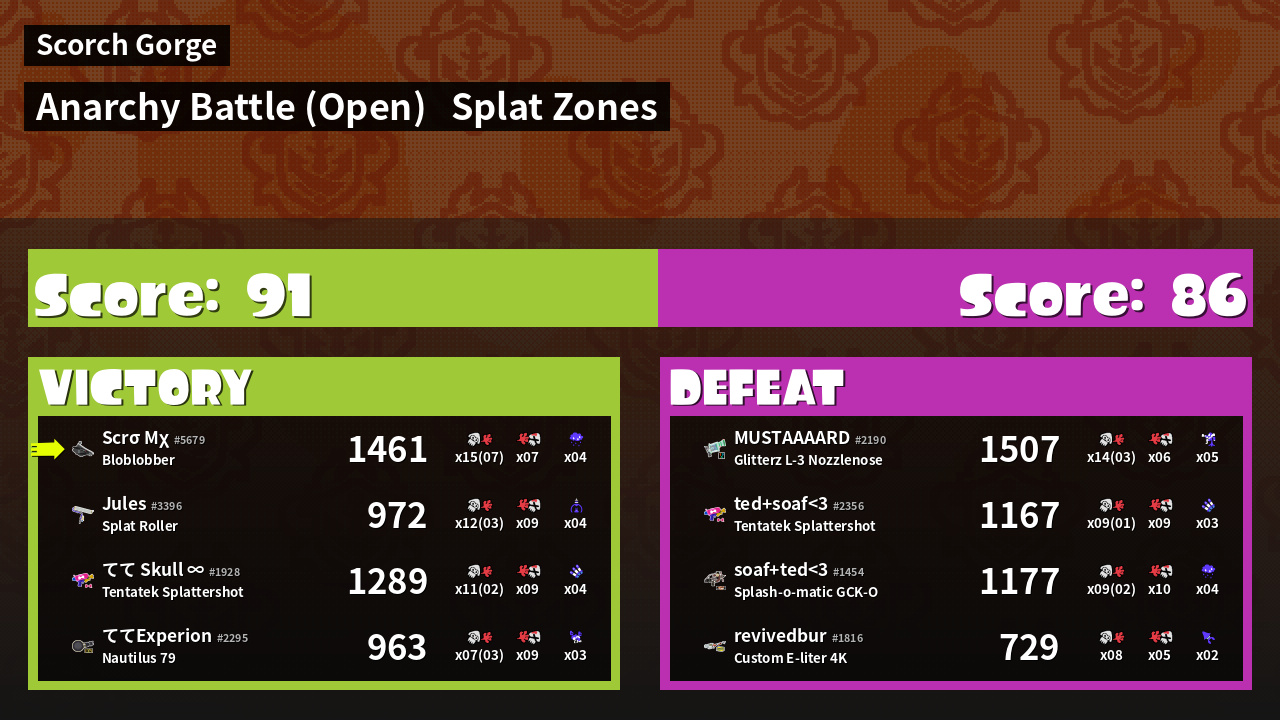 | Mode | Splat Zones - Anarchy Battle (Open) |