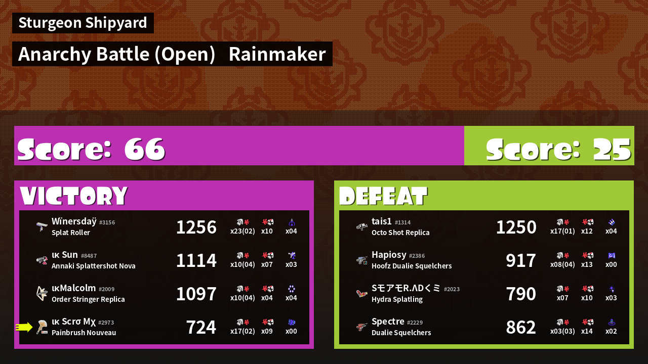 | Medals | #1 Rainmaker Stopper #2 Overall Splatter #2 Enemy Splatter | ||