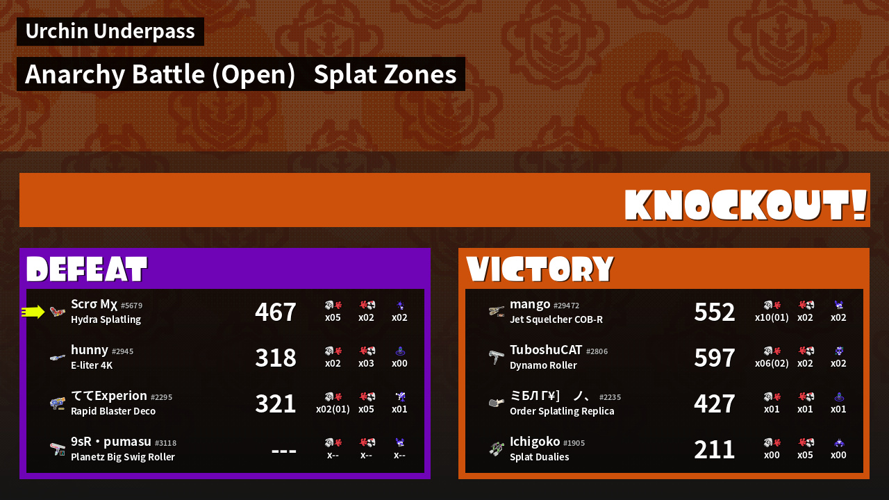 | Mode | Splat Zones - Anarchy Battle (Open) |