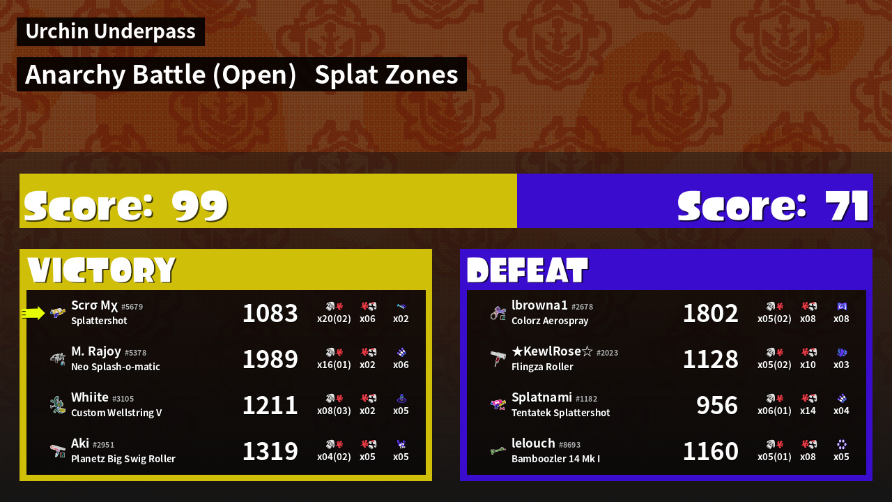 | Mode | Splat Zones - Anarchy Battle (Open) |