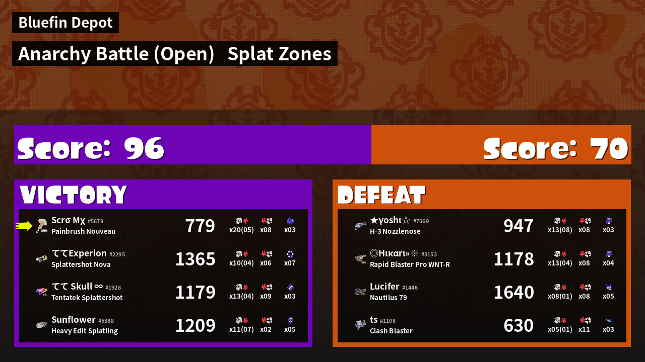 | Mode | Splat Zones - Anarchy Battle (Open) |