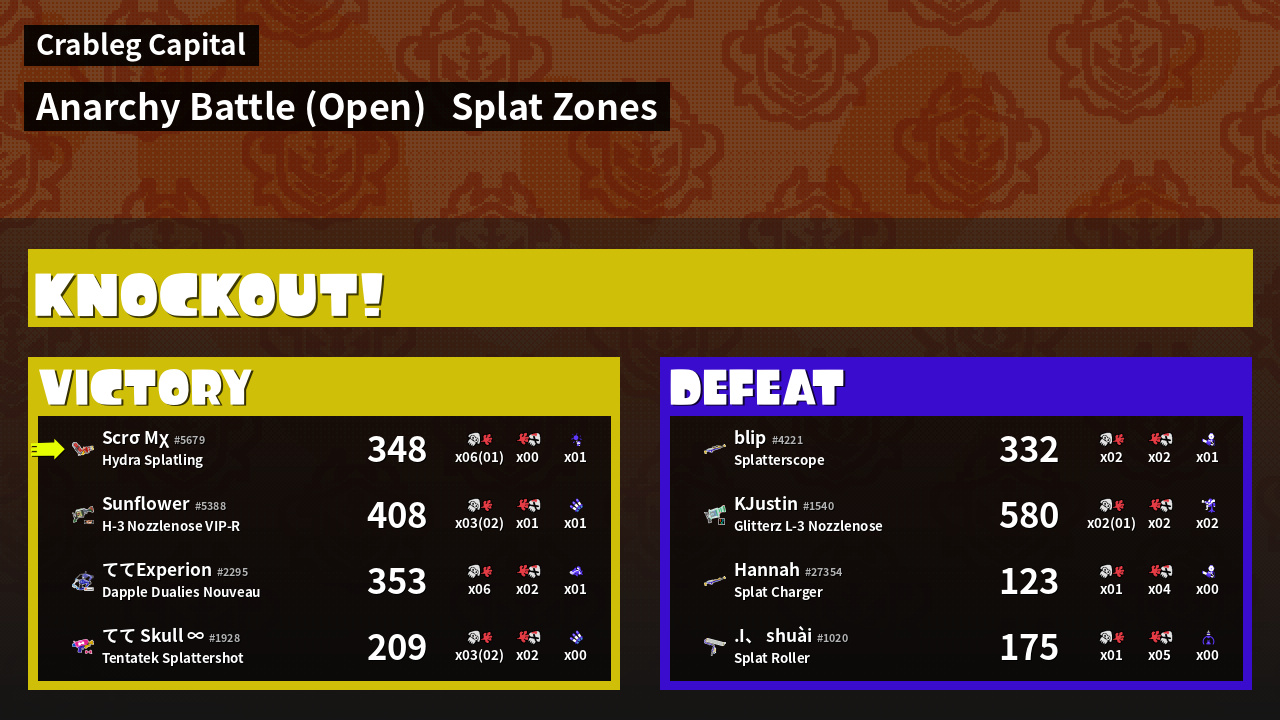 | Mode | Splat Zones - Anarchy Battle (Open) |