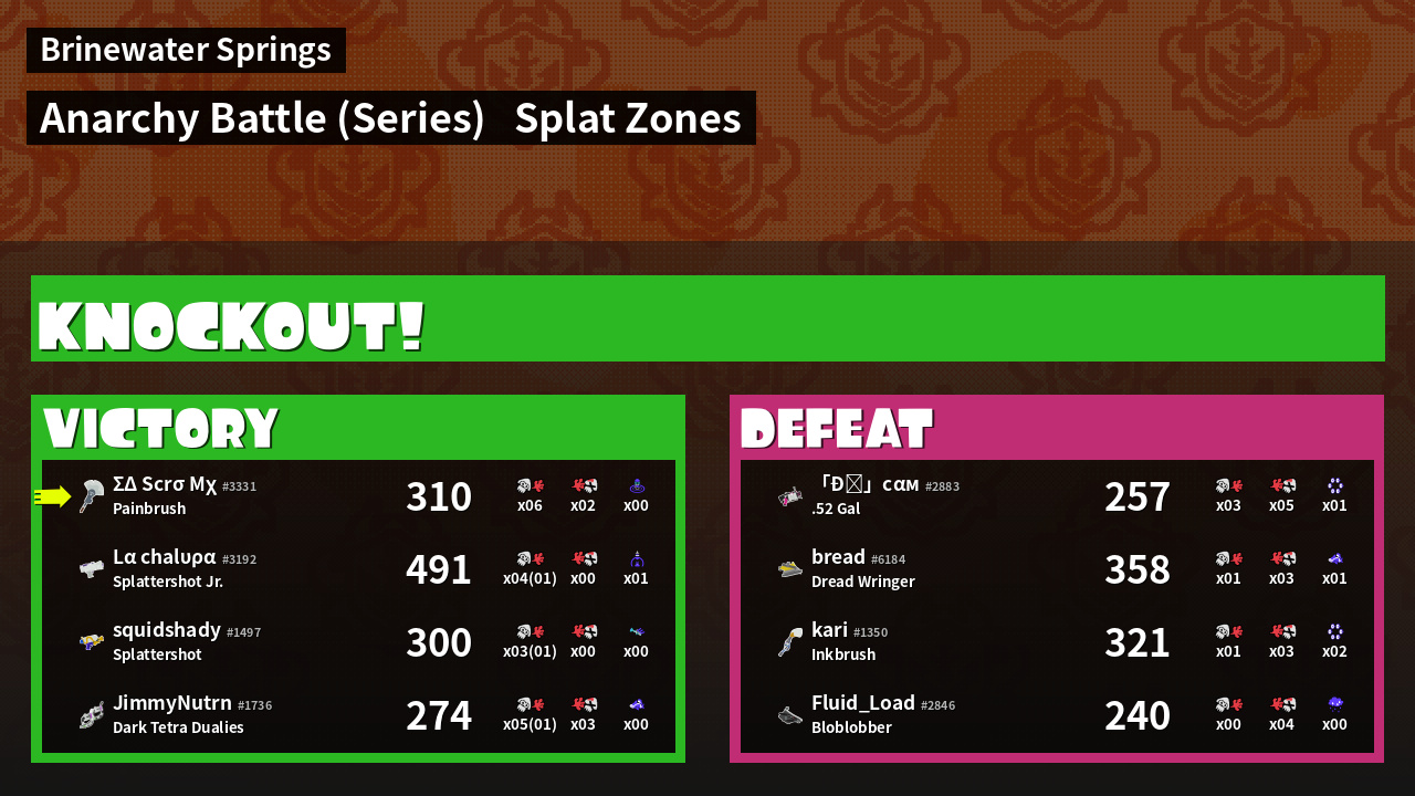 | Medals | #1 Overall Splatter #1 Splat Zone Guard #1 Enemy Splatter | ||