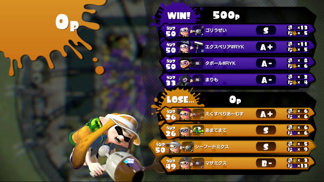 | Wasabi Splattershot | 26 | S | 6 / 6 = | 1.00 | 50.0% | |