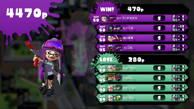 | Custom Hydra Splatling | 50 | S | 7 / 2 > | 3.50 | 77.8% | |