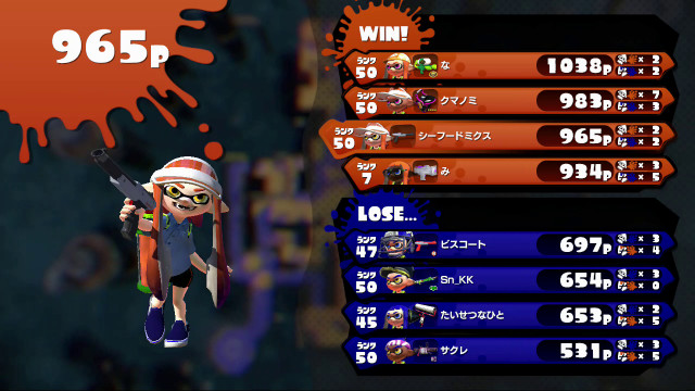 | Splattershot Jr. | 7 | 934 | 3 / 5 < | 0.60 | 37.5% | |
