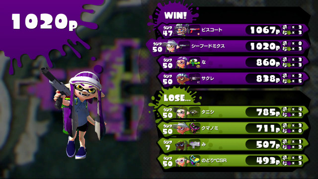 | Splattershot Jr. | 7 | 507 | 1 / 2 < | 0.50 | 33.3% | |