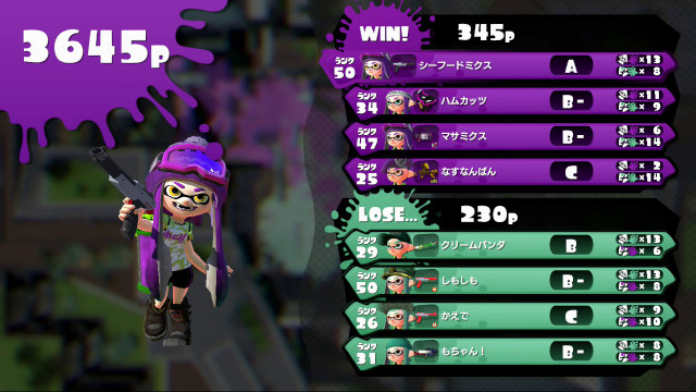 | Splattershot Pro | 31 | B- | 8 / 8 = | 1.00 | 50.0% | |