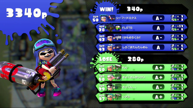 | Tentatek Splattershot | 28 | A | 13 / 5 > | 2.60 | 72.2% | |