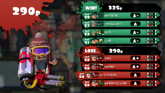 | Zink Mini Splatling | 33 | A- | 2 / 2 = | 1.00 | 50.0% | |