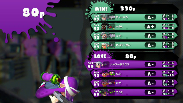 | Splattershot Jr. | 39 | A- | 8 / 5 > | 1.60 | 61.5% | |