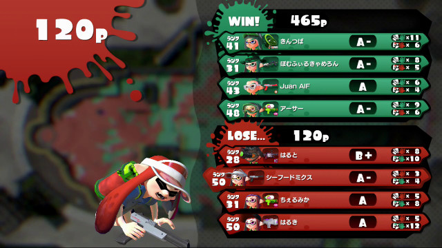 | Splattershot Jr. | 50 | A | 5 / 12 < | 0.42 | 29.4% | |