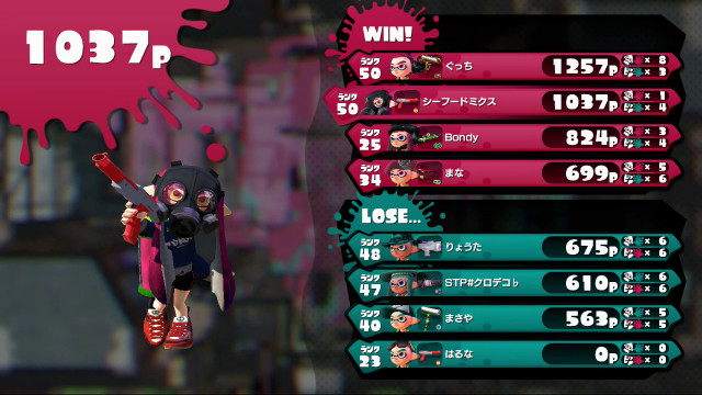 | Splattershot Jr. | 48 | 675 | 6 / 6 = | 1.00 | 50.0% | |