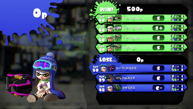 | Splattershot Jr. | 50 | S+ | 5 / 2 > | 2.50 | 71.4% | |
