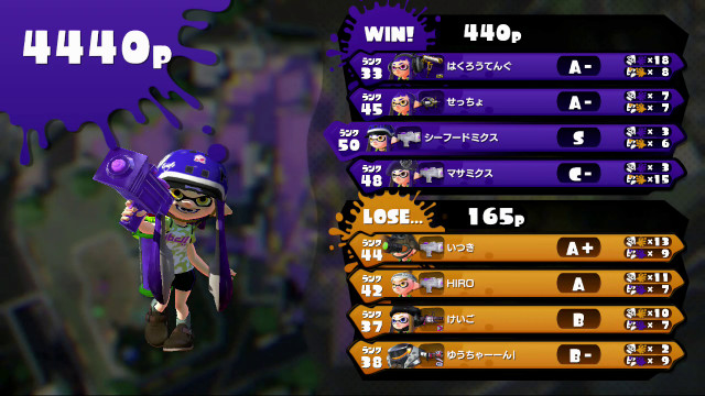 | Splattershot Jr. | 44 | A+ | 13 / 9 > | 1.44 | 59.1% | |