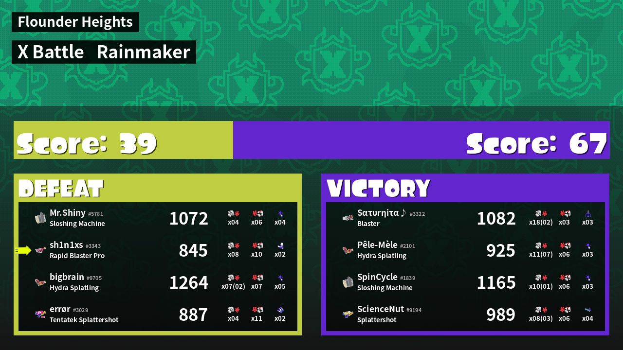 | Medals | #1 Overall Splatter #1 Enemy Splatter #1 Rainmaker Stopper | ||