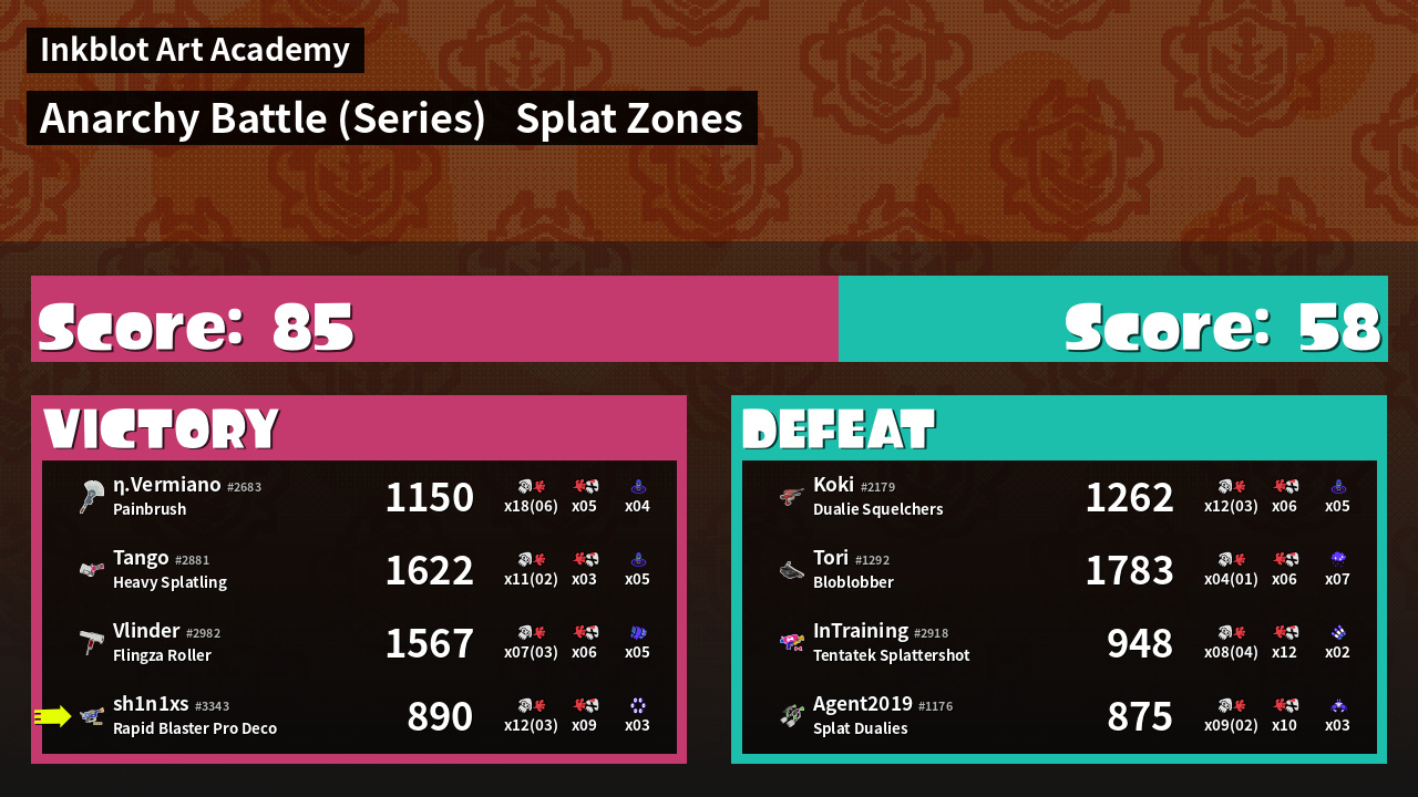 | Medals | #1 Splat Zone Guard #1 Killer Wail 5.1 User #2 Overall Splatter | ||