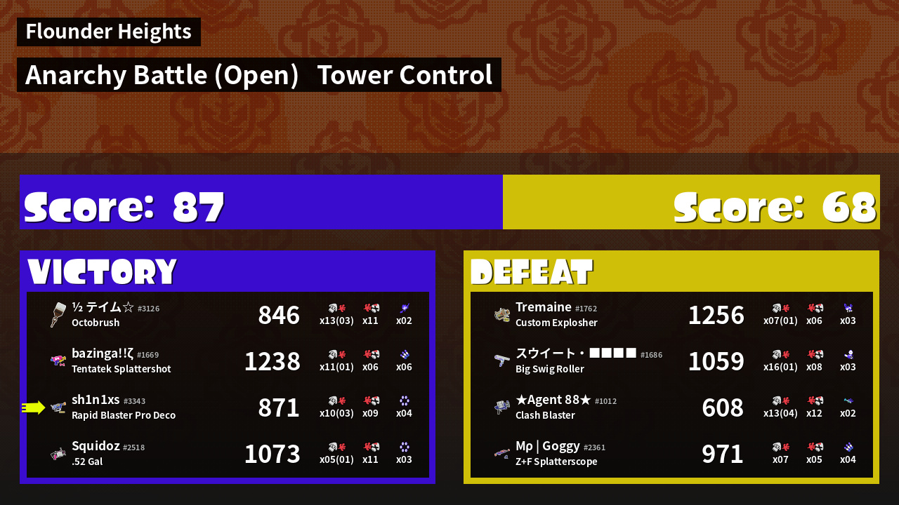 | Medals | #1 Score Booster #1 Splat Assister #1 Ground Traveler | ||