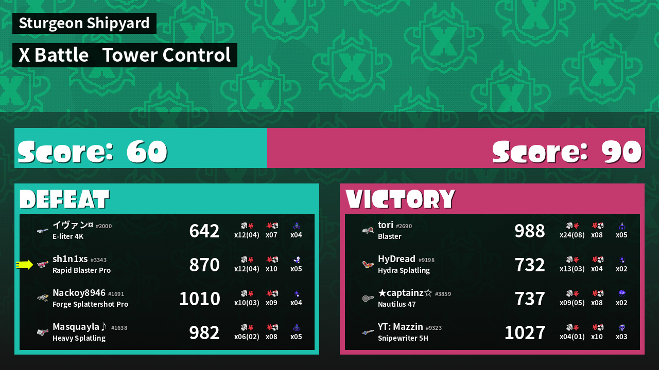 | Medals | #1 Overall Splatter #1 Enemy Splatter #1 Splat Assister | ||