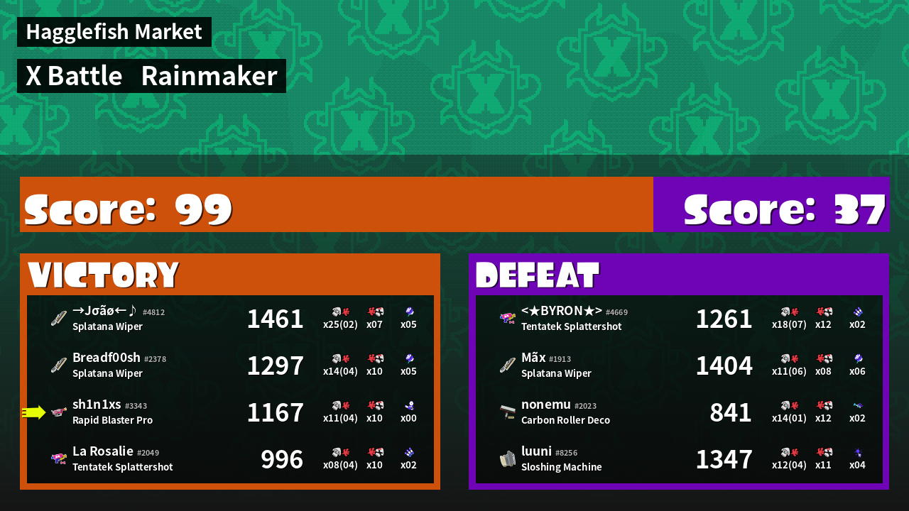 | Medals | #1 Popular Target #1 Super Jump Spot #1 Splat Assister | ||