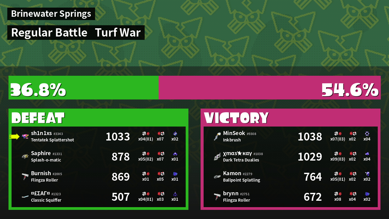 | Medals | #1 Turf Inker #1 Enemy Splatter #1 Ink Consumer | ||