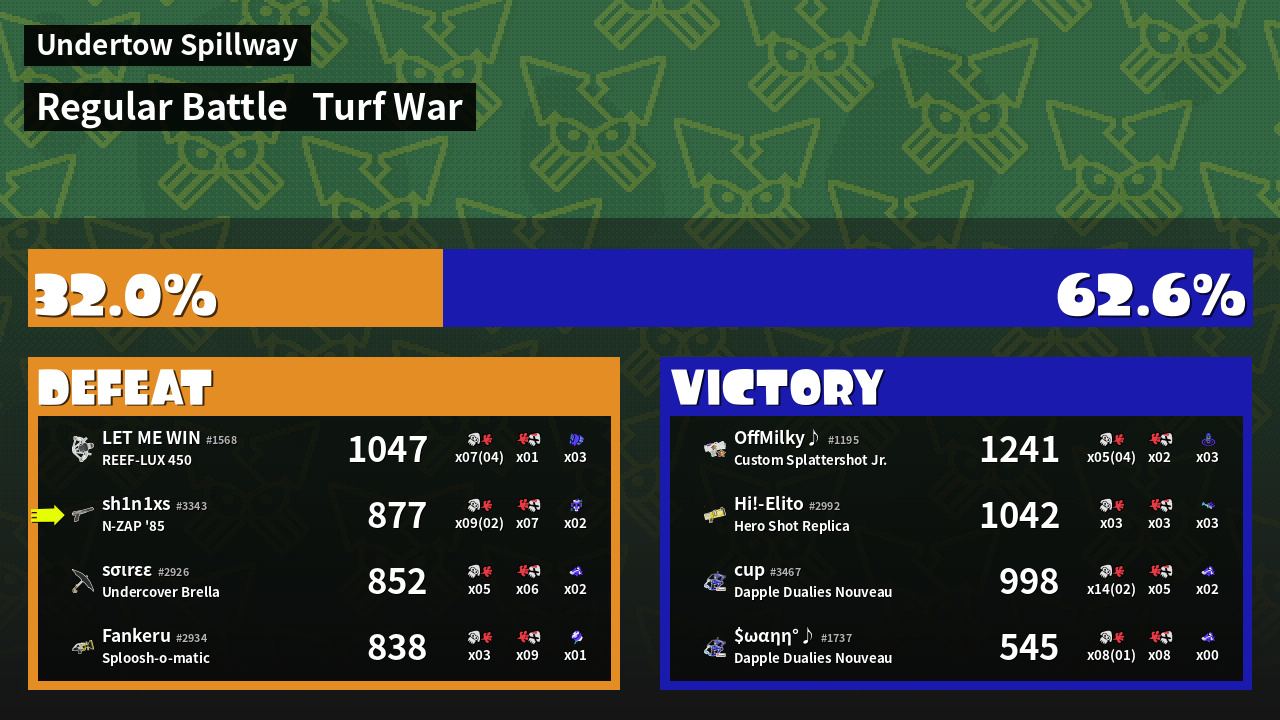 | Medals | #1 Overall Splatter #1 Enemy-Base Inker #1 Enemy Splatter | ||