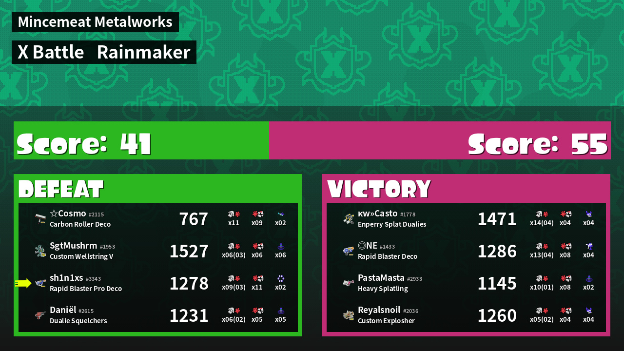 | Medals |  #1 Popular Target  #1 Splat Assister  #1 Rainmaker Carrier | ||