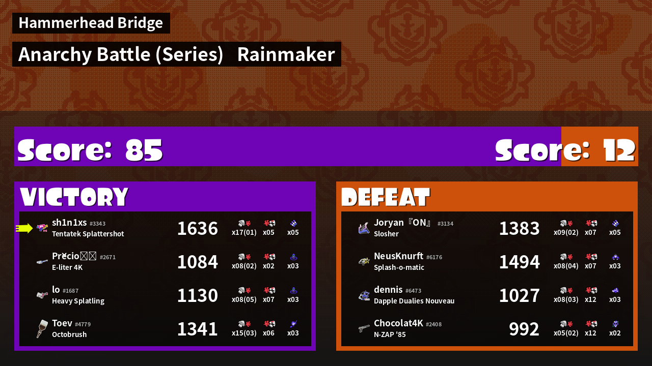 | Medals | #1 Overall Splatter #1 Turf Inker #1 Enemy Splatter | ||