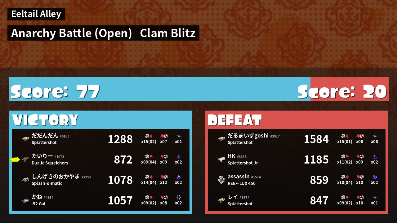 | Medals | #1 Clam Carrier #1 Splat Assister #1 Ink Consumer | ||