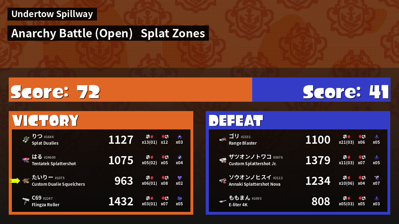| Mode | Splat Zones - Anarchy Battle (Open) | ||